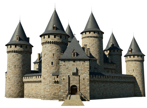 Majestic stone medieval castle with multiple towers and conical roofs isolated on transparent background