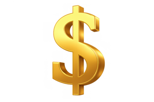 Golden dollar currency symbol icon standing upright. Representing financial success, investing, saving, and economic growth with a transparent background