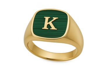 Elegant gold signet ring with green malachite and letter K, transparent background