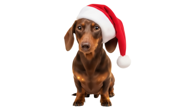 Adorable dachshund puppy with Santa hat isolated PNG, festive Christmas dog on transparent background for holiday designs and seasonal greetings