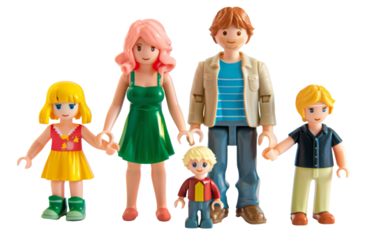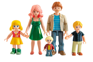 Family of parents and three children in toy figures. Transparent background