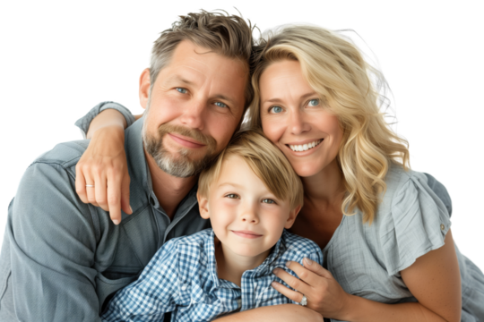 Happy family sitting together on a gray sofa in a home setting. The image captures a moment of connection and love. The father, mother and child pose, their bodies forming a cohesive unit on PNG