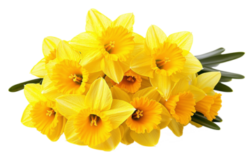 Beautiful bouquet of yellow daffodils or narcissus isolated on white, transparent background, PNG. Blooming spring flowers, Easter bells. Spring greeting card, invitation card, birthday, mother's day