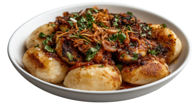 Flavorful dahi vada with potatoes and yogurt, showcasing the essence of Indian cuisine and spices, studio view, isolated on transparent background.