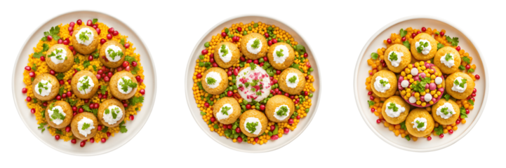 Set For Three plates of delicious dahi puri, an indian street food isolated on transparent background