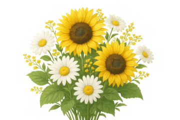 Sunflowers and daisies forming bright floral bouquet, displaying cheerful summer palette against transparent backdrop