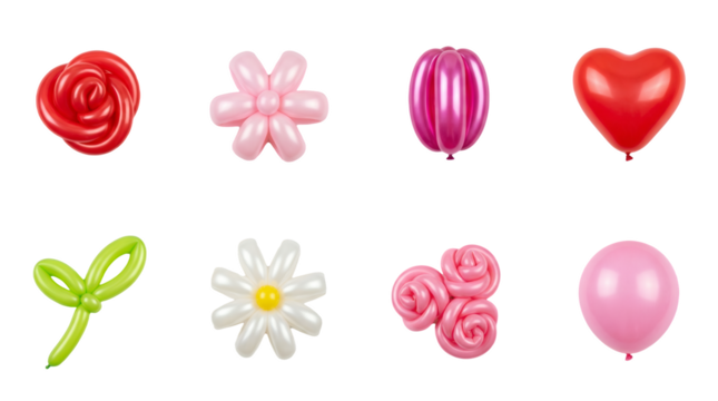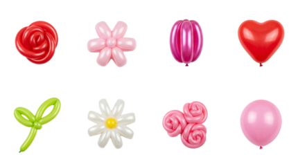 Balloon art set including rose, daisy, heart, leaf, and round shapes isolated. Decorative party and celebration collection.