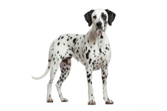 A cheerful Dalmatian stands alert, its sleek white coat dotted with bold black spots, isolated on a transparent background