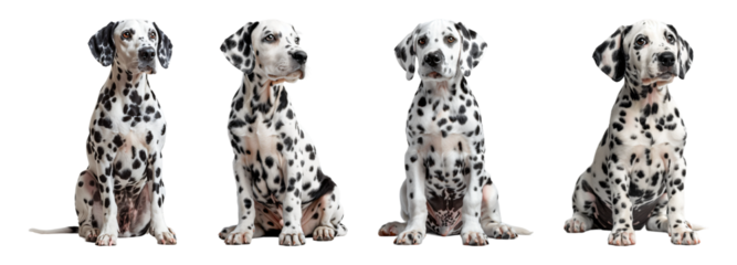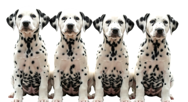 Four adorable dalmatian puppies sitting together isolated on transparent background