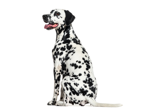 Sitting Dalmatian Dog with Relaxed Posture and Wagging Tail, Isolated on White