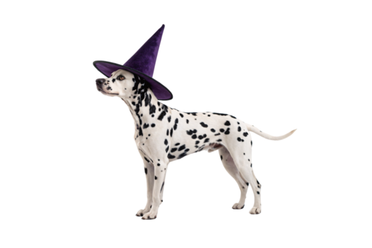 Dalmatian dog wearing purple witch hat standing sideways looking left with spots visible, isolated on a transparent background