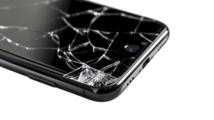 Cracked smartphone screen with shattered glass, highlighting mobile device repair needs, damage assessment, and repair process for cracked displays and electronic malfunction.