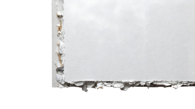 Close up of a white wall with peeling paint and visible damage on the edges and corner sections