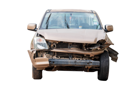 Front of old car get damaged by accident on the road. damaged cars after collision. isolated on transparent background, PNG file.