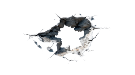 Breach in the Wall: A stark visual of a bullet hole, showcasing the impact and damage with cracked concrete fragments, perfect for conveying themes of destruction or breaches.