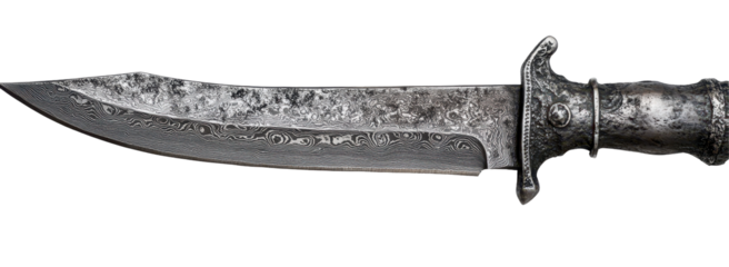 Ornate damascus steel hunting knife with intricate wood handle design. Cut out PNG