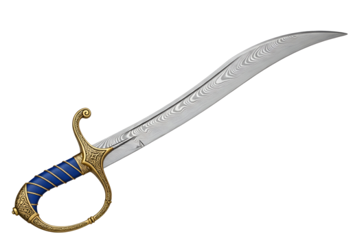 A meticulously crafted, ornate saber with a gleaming, damascus steel blade and detailed, golden hilt.