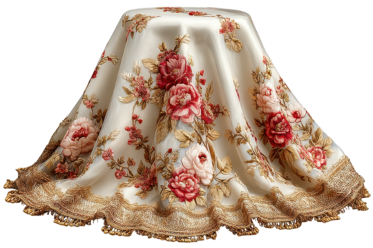 Elegant floral tablecloth with red and pink roses drapes over a round table top on transparent background