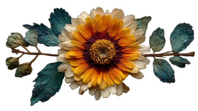 Ilustrasi bunga matahari tunggal dengan daun dan ranting di sisi-sisinya, menciptakan elemen dekoratif horizontal.