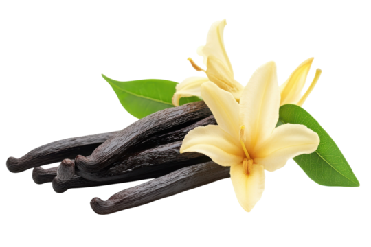 Sweet Vanilla Embrace Fragrant blossoms meet dark vanilla beans in an aromatic dance on a stark isolated on transparent background. Generative Ai.