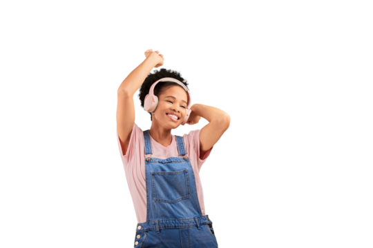 Woman, dance and music for headphones audio or radio, rock listen or isolated transparent png background. Black person, move and smile for streaming playlist or jazz song track, podcast or hip hop