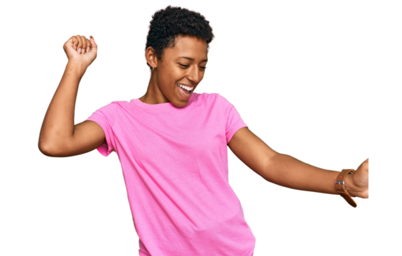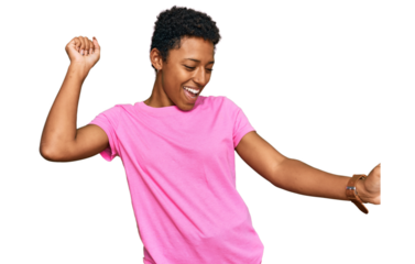 Beautiful african young woman wearing casual clothes dancing happy and cheerful, smiling moving casual and confident listening to music