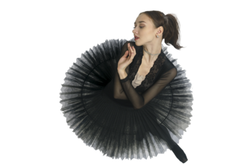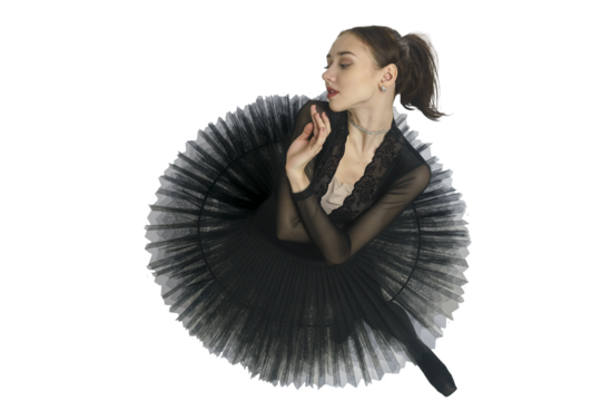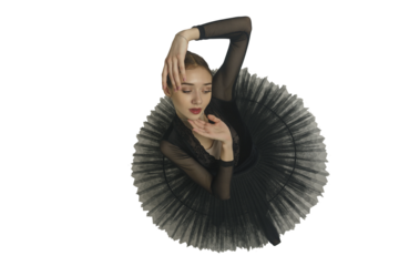 portrait of a young ballerina in a black tutu dancing with her hands moving top view, immersion in dance, isolated on transparent background, png