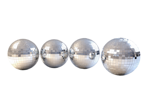 Shiny disco balls in different sizes casting light reflections, isolated on white background.  PNG transparent.