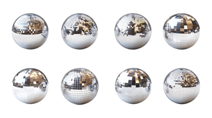 Set of shiny disco balls with reflective surfaces, isolated on transparent cutout background