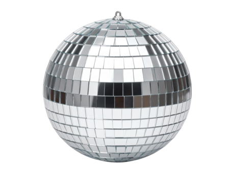 Illuminated disco ball sparkles brilliantly, reflecting dots of light like stars across a dark dancefloor atmosphere, isolated on a transparent background