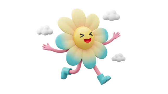 Joyful 3D flower character running among clouds, a cheerful whimsical illustration