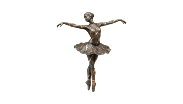 Bronze and copper ballerina statue dancing gracefully en pointe with arms outstretched in an elegant pose, wearing a classic tutu and pointe shoes with decorative ribbon details