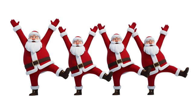 Four santa clauses dancing in a row