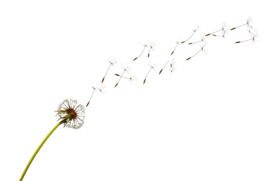 Hyper realistic dandelion seed head blowing in wind, isolated on a transparent background