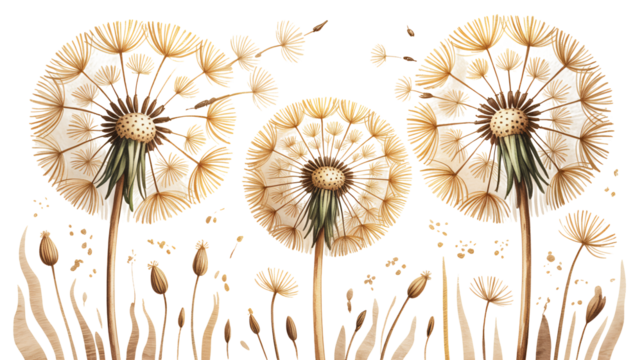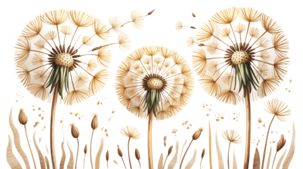 Three dandelion flowers with seeds dispersing in the wind on a white background