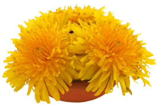 Fresh yellow Dandelions in the marble mortar isolated on a transparent background