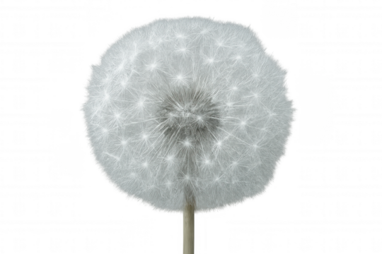 Close-up of dandelion seed head with delicate white parachute seeds, ready to disperse on transparent background
