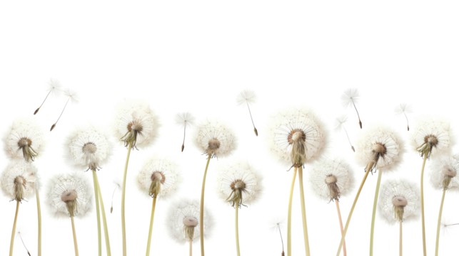 Lots of dandelion seed heads at different focal distances and sizes as if in a field with seeds floating away in the wind on a transparent background.