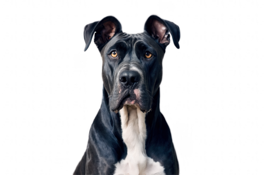 A majestic great dane sits attentively against a black backdrop on transparent background png