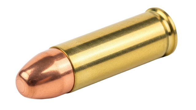 Shiny brass bullet isolated PNG, ammunition for handgun or rifle on transparent background, cartridge for shooting range and hunting