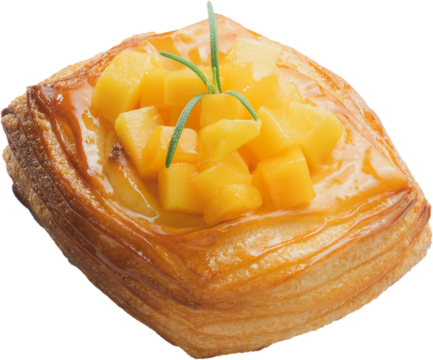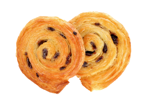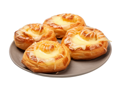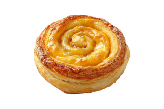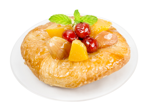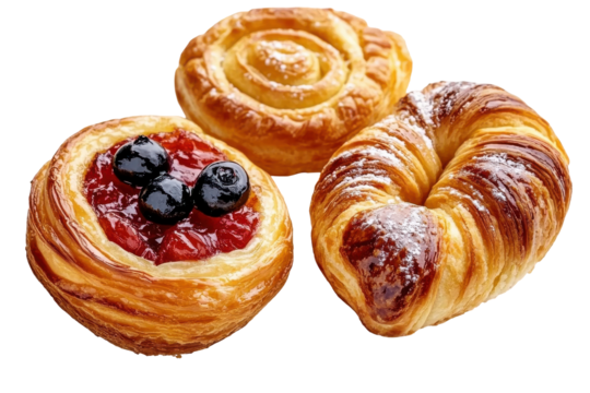 Delicious pastries including a fruit danish cinnamon roll and croissant isolated on transparent background. Danish pastry isolated on white background.
