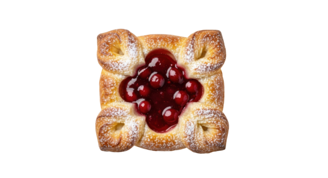 Isolated cherry danish pastry, dusted with sugar, a sweet and flaky breakfast or snack item