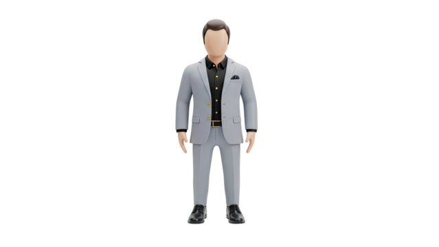 3D Man in Gray Suit and Black Shirt, Isolated on transparent background