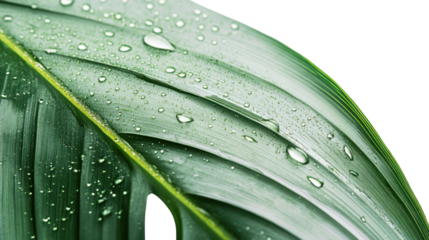 Close-up of a green leaf covered in droplets of water, showcasing its vibrant texture and natural beauty. Ideal for nature and freshness themes.