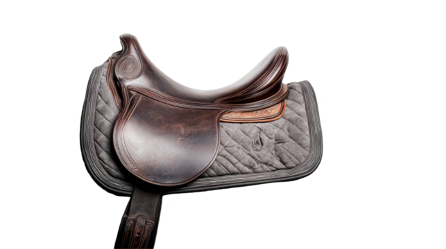 detailed close up of saddle on dapple gray horse, showcasing craftsmanship and design
