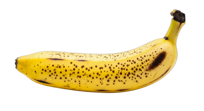 A single ripe yellow banana with brown sugar spots 1. PNG Transparent