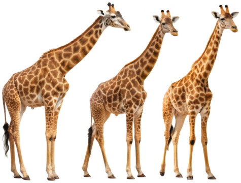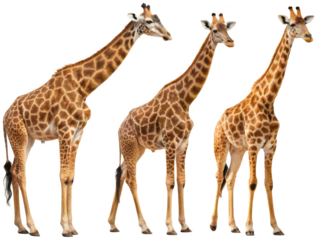 Three lifelike and photorealistic giraffes, rendered with intricate detail of their brown and tan spotted coats and long necks, standing gracefully on their, isolated on transparent background.