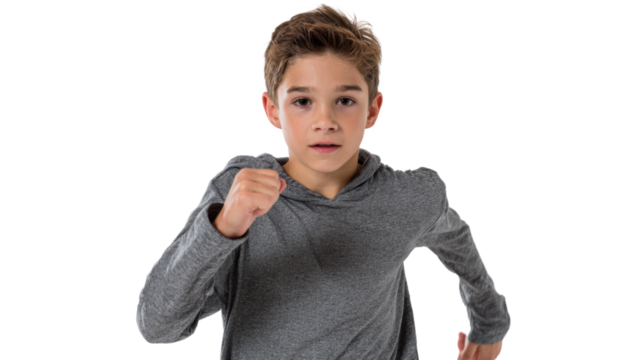 A young boy in a gray hoodie running with determination on a white isolated background.