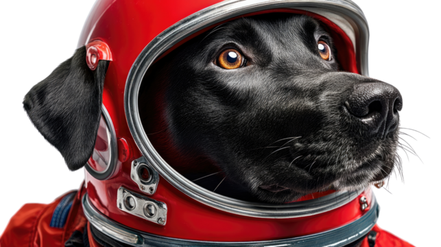 Dog in Space: A black dog in a red spacesuit gazes skyward, ready for an adventure among the stars.