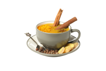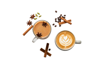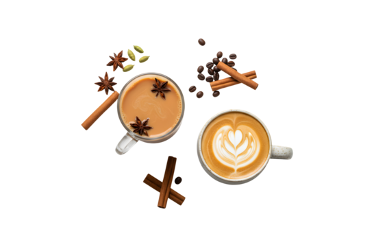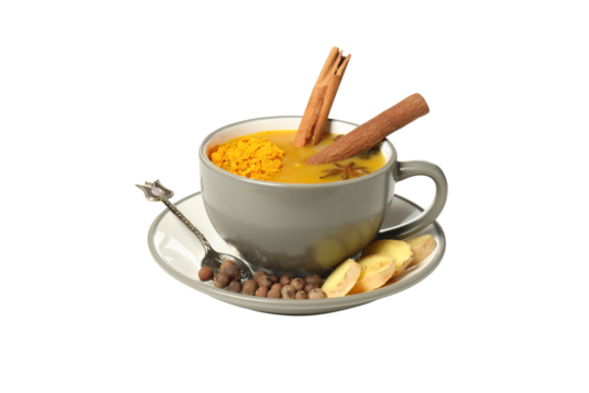 Cup of masala chai topped with ginger powder on transparent background for promoting cafes, menus, or recipe blogs, drink advertisements, or social media content. Masala, tea with milk and spices